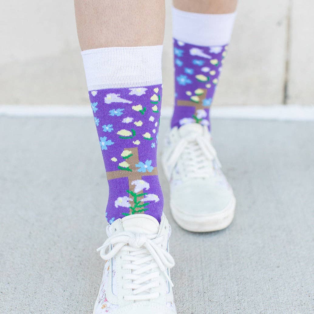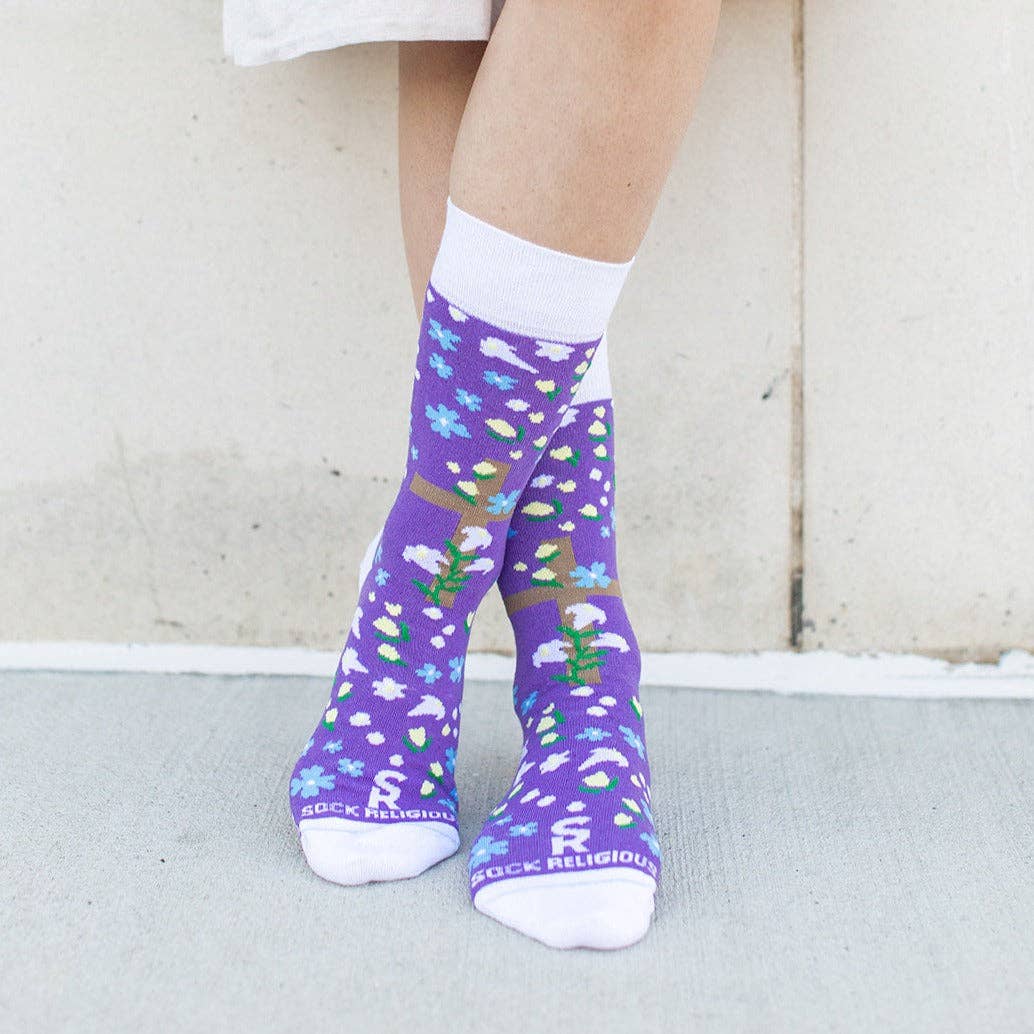 Celebrate the joy of Easter with every step in our Easter Bloom Adult Socks! These socks combine faith and fashion with a vibrant floral design inspired by the renewal of spring. Featuring subtle Easter symbols like crosses and lilies, they remind you of the beauty of the Resurrection with every step you take. Whether you’re heading to Mass, joining an Easter egg hunt, or enjoying brunch with family, these socks are the perfect way to add a touch of faith-filled cheer to your outfit.
