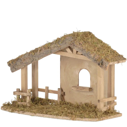 This traditional stucco-style stable captures the warmth and simplicity of the Holy Night. Featuring a hand-finished plaster look with wooden beams, a bark-covered roof, and soft moss accents, it brings depth and realism to your nativity display. The arched window detail adds a touch of old-world charm, making it the perfect home for your 5" Fontanini figures. Thoughtfully crafted to evoke the quiet beauty of Bethlehem, this piece blends rustic texture with timeless design.