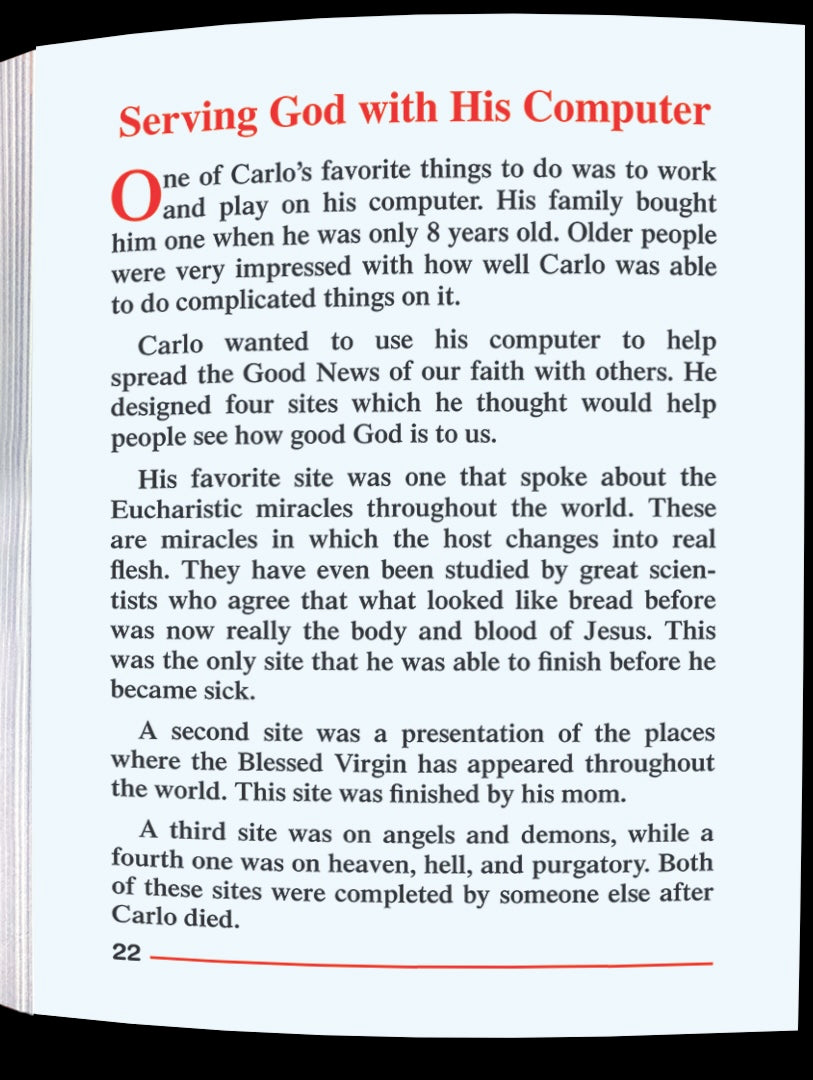 Your child will be wowed by this brand new, young Saint who could easily replace their super hero or princess. They will learn about a happy and playful child who loved the Blessed Mother and taught his friends to pray the Rosary. Full-color illustrations and simple text show that Carlo was not afraid to defend the underdog and to feed the hungry and homeless. As a teenager he used his computer skills to spread the Good News and create sites on the world-wide Eucharistic miracles and Blessed Virgin’s appearances. Carlo Acutis wanted to be a saint and he became one. Role models come and go; Saints go on forever to give glory to God! 32 pages.