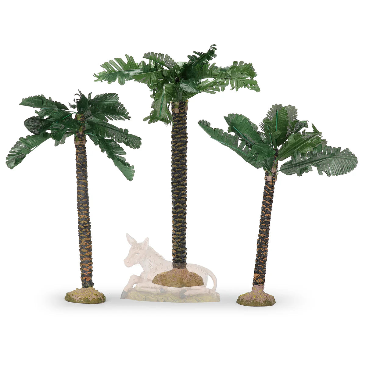 This 3-PC palm tree set adds height, texture, and authentic Middle Eastern detail to your nativity village. Each tree features a tall, textured brown trunk and lush green fronds that spread outward to create natural shade and dimension. Arrange them beside buildings, along pathways, or near the stable to frame your scene and give it a more realistic setting. With three sizes included, these palms bring variety and balance, making your nativity display feel complete and full of life.