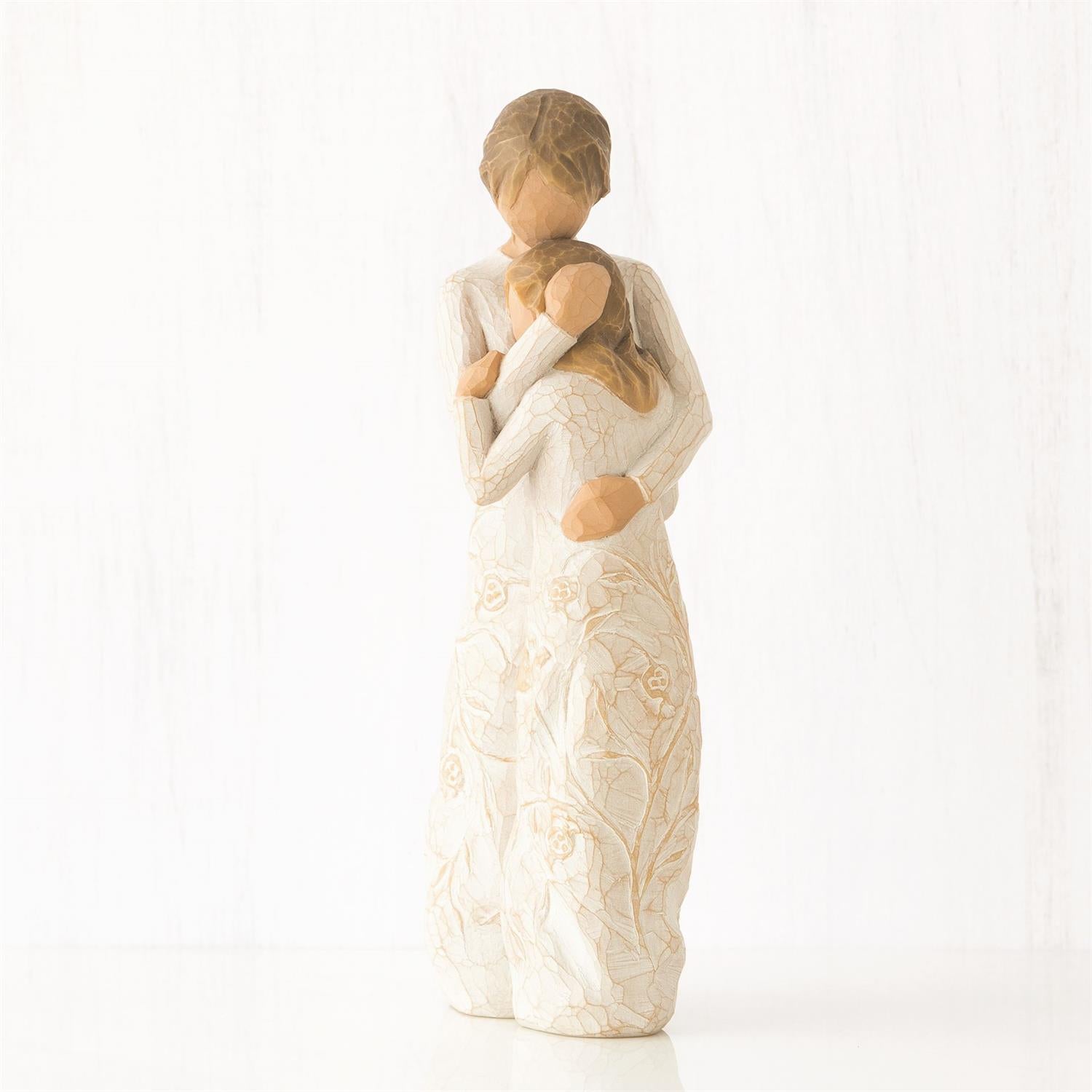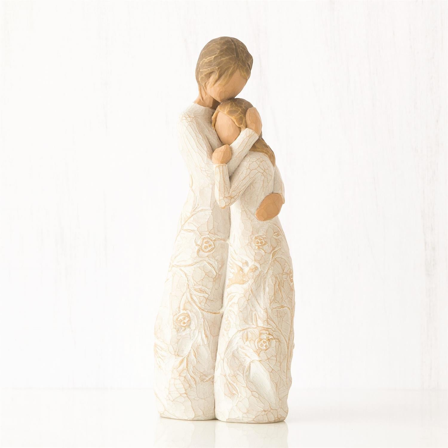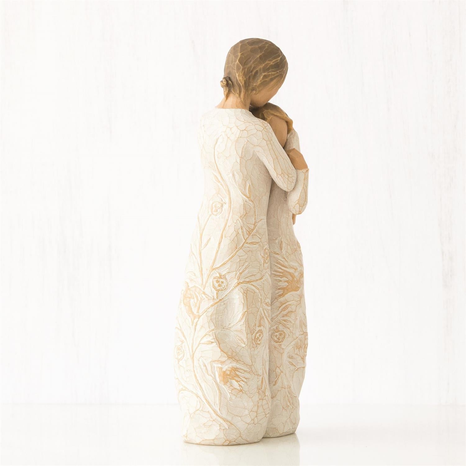 Carved with intertwined vines and birds in flight, Close to me is a mother/daughter figure that expresses the connection, yet freedom, which exists in the best of relationships, near or far. Willow Tree is a reminder of someone we want to keep close, or a memory we want to touch. Hand-carved figures reveal their expression through body gestures only… a tilt of the head, placement of the hands, a turn of the body. Each piece is designed to be open to interpretation from the viewer. “Willow Tree isn’t so much about the tangible piece. It represents an emotion, or it marks a memory.” —Susan Lordi. A gift of Willow Tree® communicates beyond words.