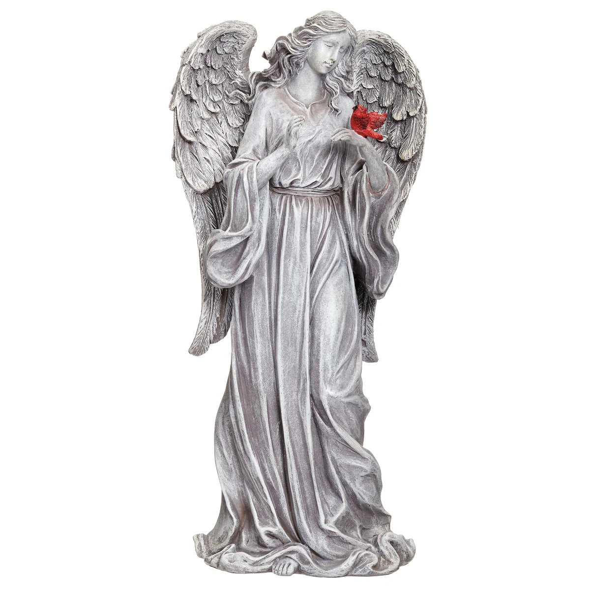 Celebrate the comforting presence of loved ones with this beautifully sculpted memorial statue. An elegant angel holds a vivid red cardinal, symbolizing hope, peace, and spiritual connection. Detailed with graceful wings, flowing robes, and a stone-textured finish, this piece is a heartfelt tribute for outdoor gardens, memorial spaces, or prayer corners, offering reflection and lasting grace.